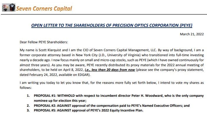 Klarquist Scott Sent A Letter To The Board Of Directors Of Precision Optics Corporation, Inc.Mar 21, 2022∙ PaidShareThis post is for paid subscribersSubscribeAlready a paid subscriber? Sign inPreviousNext