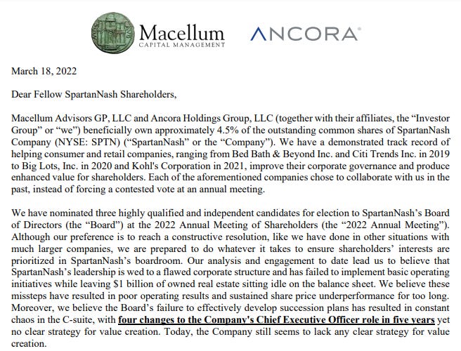 Macellum Advisors GP, LLC Sent A Letter To The Board Of Directors Of SpartanNash Co Mar 18, 2022∙ PaidShareThis post is for paid subscribersSubscribeAlready a paid subscriber? Sign inPreviousNext