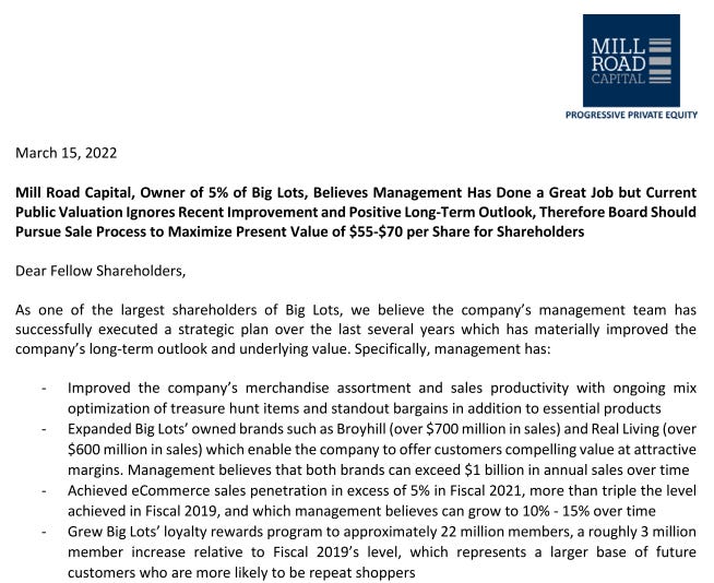 Mill Road Capital III, L.P. Sent A Letter To The Board Of Directors Of Big Lots IncMar 15, 2022∙ PaidShareThis post is for paid subscribersSubscribeAlready a paid subscriber? Sign inPreviousNext
