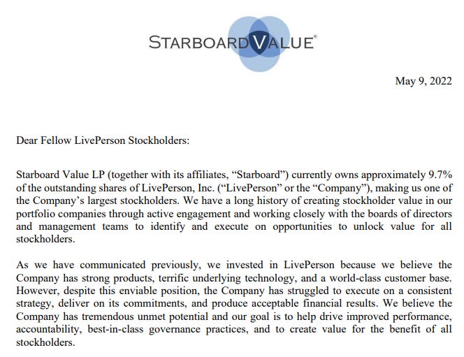 Starboard Value LP Sent A Letter To Stockholders Of LivePerson IncMay 09, 2022∙ PaidShareThis post is for paid subscribersSubscribeAlready a paid subscriber? Sign inPreviousNext